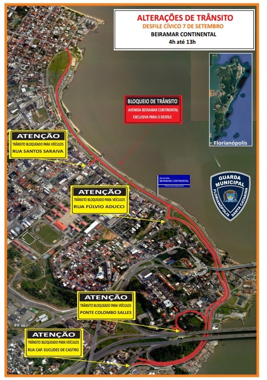 Portanto, haverá alteração de trânsito na região, com interdição de vias das 4h às 13h (conforme infográfico da Guarda Municipal de Florianópolis). Contudo, a interdição começa parcialmente um dia antes: a partir das 7h de quarta (6), o fluxo da Beira-Mar Continental fica reduzido para montagem das estruturas. Confira abaixo as mudanças no trânsito da capital catarinense.