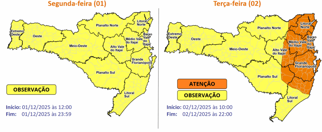 A virada de novembro e dezembro foi de tempo instável e Santa Catarina segue em alerta para riscos relacionados os temporais com chuva persistente, queda de granizo e vendavais que devem atingir todas as regiões até a noite desta terça-feira (2). Segundo o Instituto Nacional de Meteorologia (InMet) e o monitoramento meteorológico da Defesa Civil, os riscos maiores nesta segunda-feira (1º) se concentram na metade Oeste do estado, enquanto o litoral deve ser mais atingido ao longo da terça.
