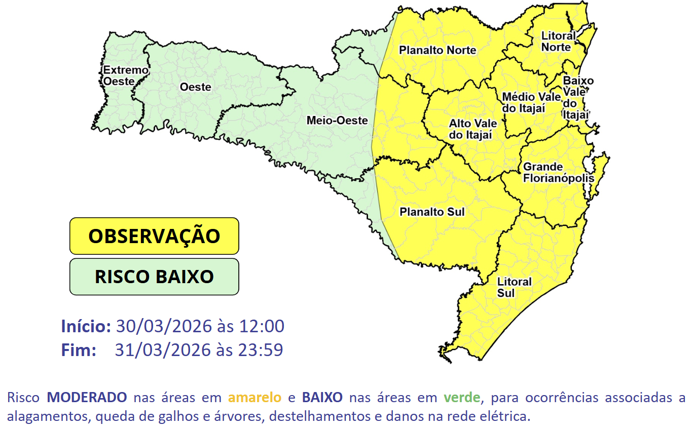 Nesta segunda, as máximas devem variar entre 30°C e 33°C dos Planaltos ao Litoral, ficando ainda mais altas no Grande Oeste, onde as temperaturas máximas ultrapassam os 35°C. O calorão associado a instabilidades na atmosfera deve provocar chuva a partir da tarde em todo o Litoral, Vale do Itajaí e nos Planaltos, onde há risco moderado para alagamentos, queda de galhos e árvores, destelhamentos e danos na rede elétrica.
