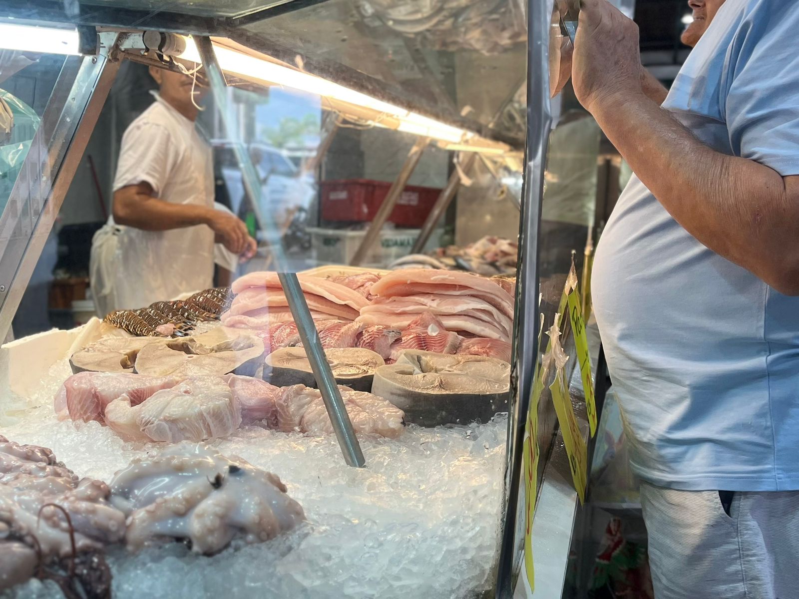 Quem buscou evitar a correria de última hora foi a Manuela, que aproveitou a manhã de quarta-feira para olhar os preços com calma. O resultado é um cardápio composto por pescada-amarela, camarão e filé de espada. “O preço estava bom, por ser um peixe nobre, estava por R$ 69,90. O camarão também, tem um preço bom aqui no Mercado Público. As peixarias dos bairros costumam ter um preço mais caro e aqui  o preço está justo”, contou Manuela.