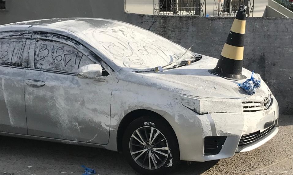 Quem passou pela avenida Deputado Edu Vieira, no Bairro Pantanal em Florianópolis, na manhã desta quarta-feira (22) viu uma cena um tanto inusitada. Um veículo que estava estacionado em uma vaga ao lado de uma residência estava totalmente sujo com massa corrida utilizada no acabamento de paredes, com palavras ofensivas, além de um cone de trânsito no capô e lixo. O carro é da cor prata ficou todo branco.