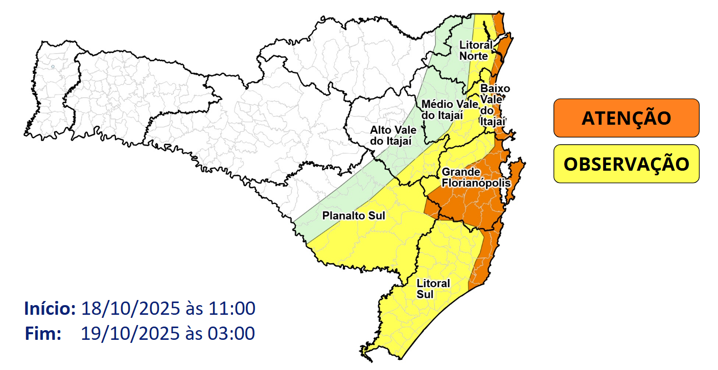 A velocidade média varia de 35 a 45 km/h, mas novamente com rajadas de 70 a 80 km/h. As mais intensas são esperadas no litoral, sobretudo na Grande Florianópolis Serrana e Litorânea e entre o Baixo Vale do Itajaí e o Litoral Norte, onde podem ultrapassar os 80-90 km/h em alguns momentos.