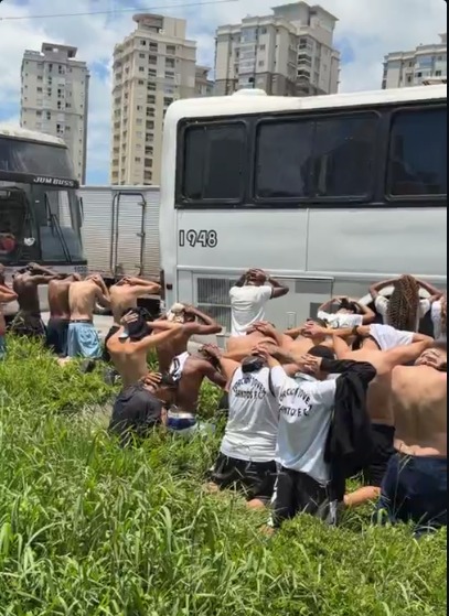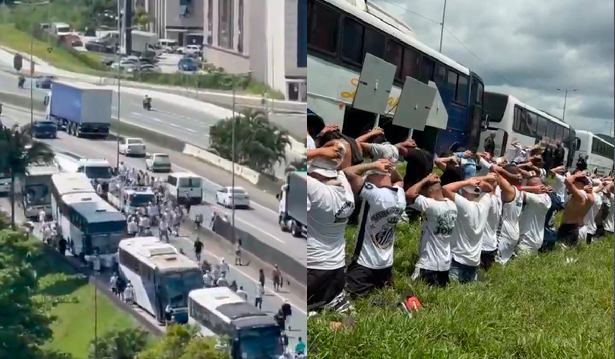 Após alguns momentos de confronto, a Polícia Rodoviária Federal (PRF) e a tropa de choque da Polícia Militar (PMSC) chegaram ao local e controlaram a situação. Em uma das imagens, diversos torcedores aparecem ajoelhados ao lado dos ônibus durante a abordagem policial.