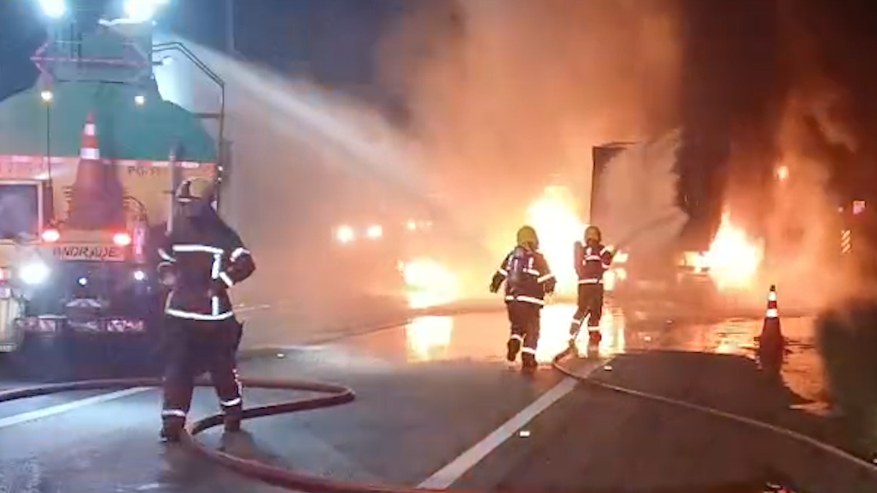 Após a colisão um dos caminhões pegou fogo e a rodovia ficou interditadas