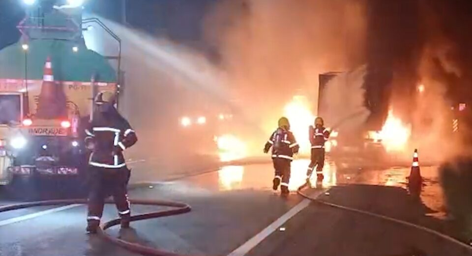 Após a colisão um dos caminhões pegou fogo e a rodovia ficou interditadas O acidente ocorreu na madrugada desta terça-feira (02) no sentido Norte da Br 101 em Governador Celso Ramos. Segundo o Corpo de Bombeiros (CBMSC), o engavetamento envolveu três caminhões e um automóvel. Após a colisão uma carreta com placas de Imbituba pegou … Continue lendo Vídeo: Caminhoneiro morre em grave engavetamento na BR 101