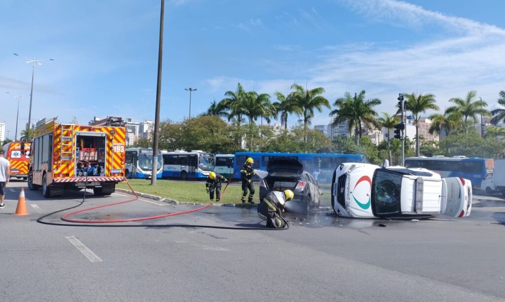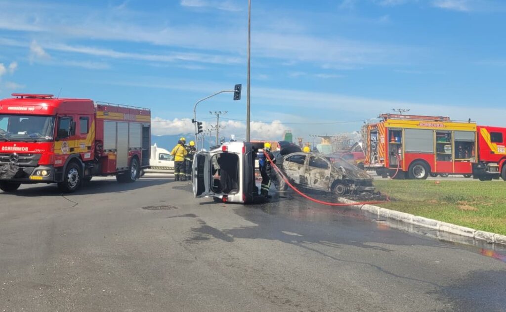 Vídeo: Carro colide em viatura do SC Transplantes e pega fogo