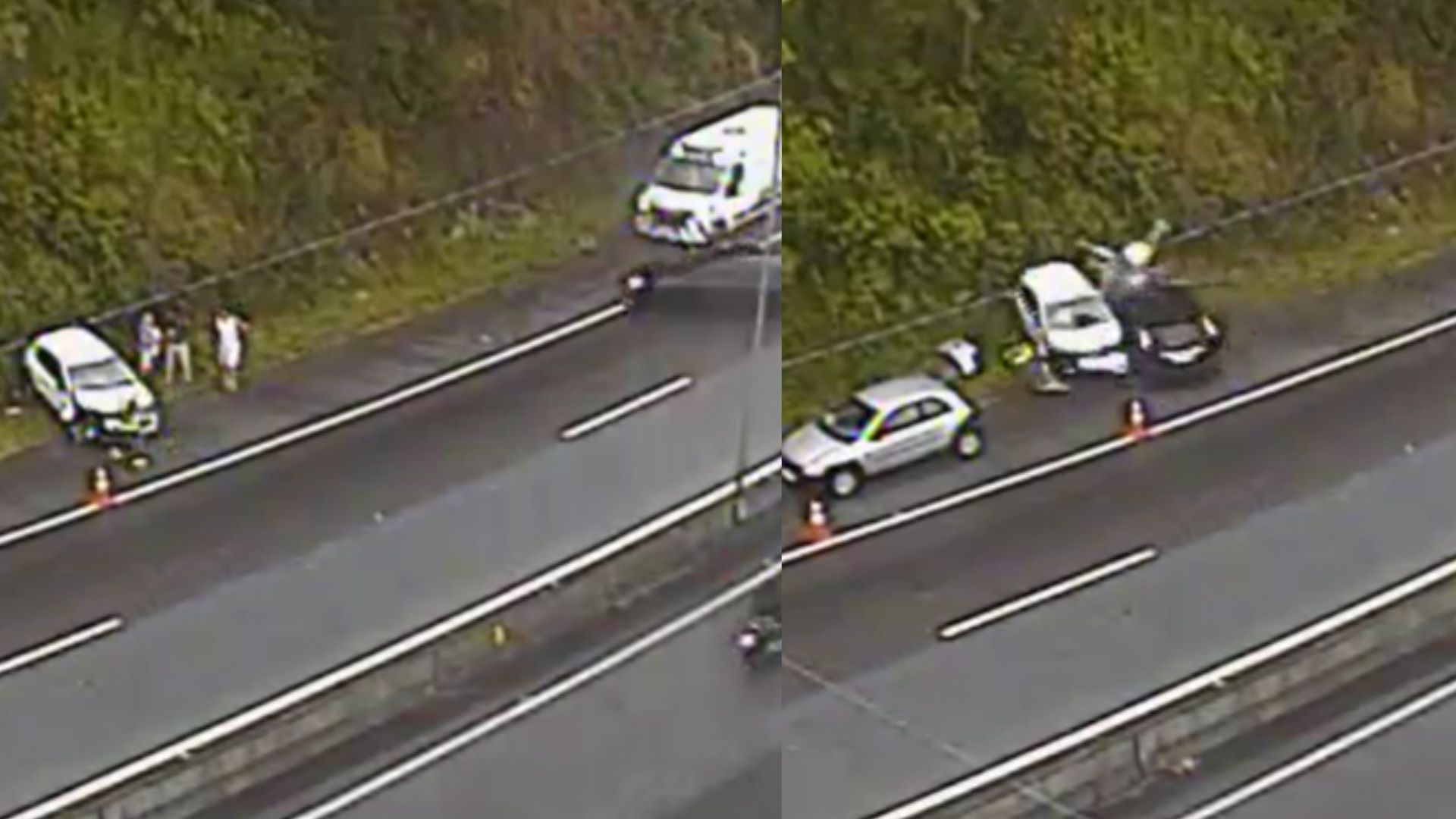 Um acidente de carro chocante foi capturado por câmeras de videomonitoramento (veja abaixo) instaladas na BR-101, em Biguaçu, durante a tarde desta véspera de Natal (24). O acidente aconteceu por volta das 17h40, quando um condutor perdeu o controle do veículo em uma curva ao derrapar em uma poça de água e atingiu quatro pessoas – dos policiais rodoviários federais e dois civis – que estavam no acostamento por conta de um incidente ocorrido anteriormente. Todos ficaram feridos, mas sem gravidade.