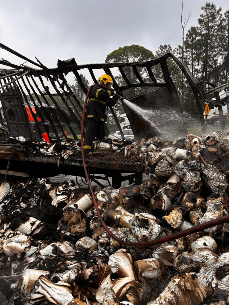 Quando os bombeiros chegaram no local, se depararam com o veículo ainda em chamas. Foi preciso cerca de 4,5 mil litros de água para apagar as chamas e a realização do rescaldo. Mesmo assim, o fogo voltou a queimar e a viatura do CBMSC precisou ser reabastecida para voltar ao local, com apoio de uma retroescavadeira para mover a carga inflamável.
