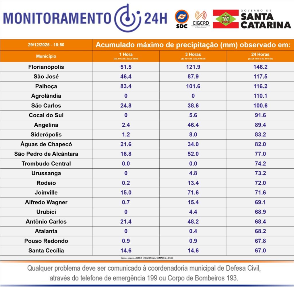 No município de Palhoça, as chuvas também são intensas. Nas últimas 3h, o município registrou precipitação de 101.6 mm, sendo que 83.4 mm foram apenas na última hora. O principal ponto de atenção é no Morro dos Cavalos, onde o grande acúmulo de água torna o trânsito mais perigoso, principalmente para quem desce.