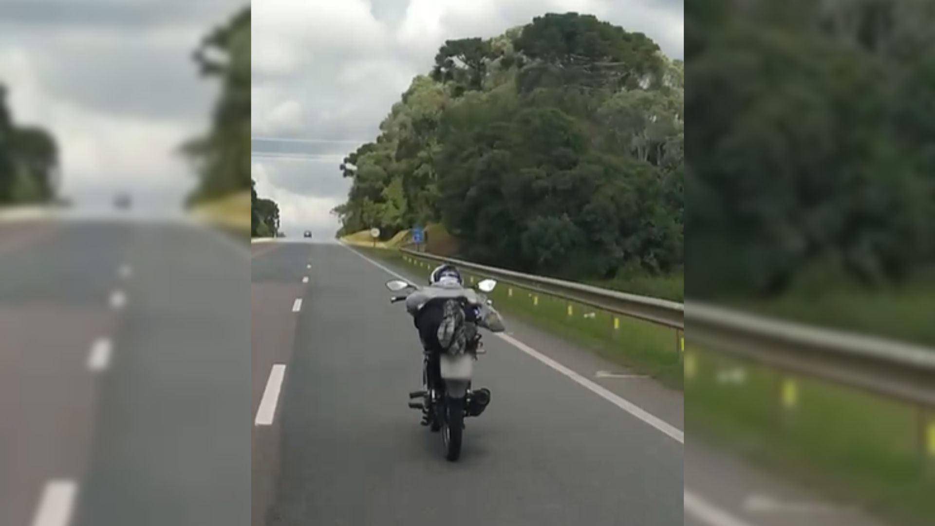 Um motociclista foi flagrado realizando uma manobra conhecida como “Superman” em plena BR-116, no município de Mafra, no Planalto Norte catarinense. A ocorrência foi registrada na manhã deste domingo de Páscoa. Um vídeo divulgado pela Polícia Rodoviária Federal (PRF) mostra o rapaz, um jovem de 23 anos, deitado sobre o banco da motocicleta, segurando-se apenas pelo guidon e, em seguida, sendo abordado pelos agentes.