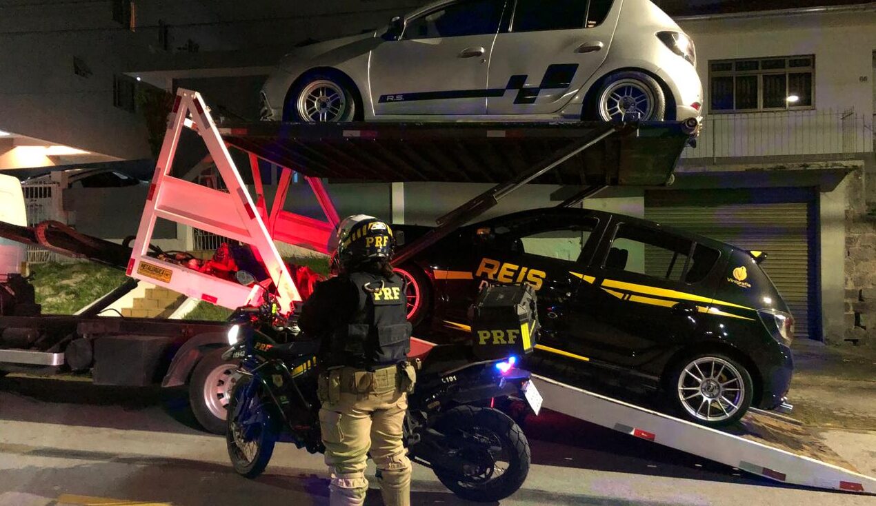 Na madrugada de sábado (25), a Polícia Rodoviária Federal (PRF) flagrou dois veículos disputando racha na BR-101, no trecho do Contorno Viário de São José, na Grande Florianópolis. A região é conhecida por apresentar sequência de curvas e elevado risco de acidentes. De acordo com a PRF, a ocorrência foi registrada por policiais que realizavam patrulhamento na região quando identificaram os automóveis em alta velocidade, no sentido Palhoça–São José.