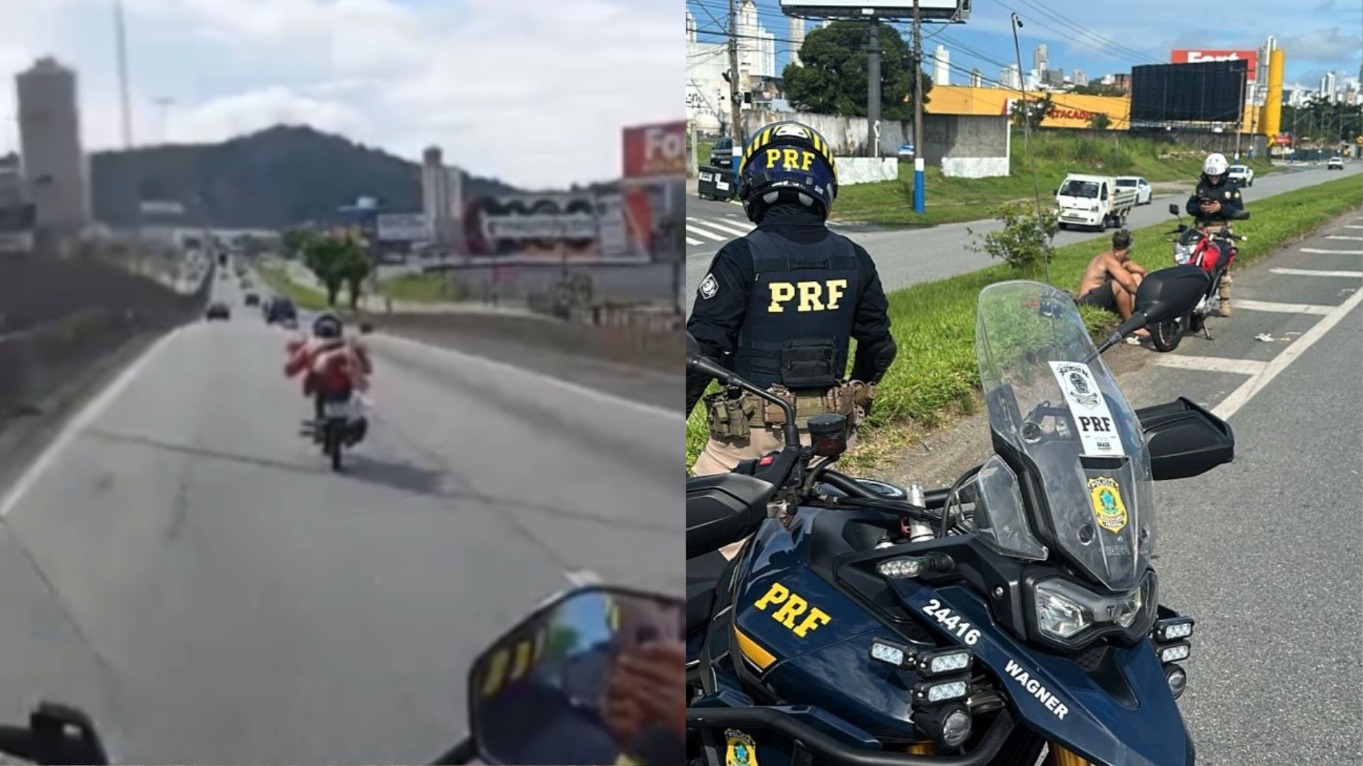 Um jovem de 19 anos foi flagrado fazendo a manobra “superman” com a moto em alta velocidade em plena BR-101. O fato aconteceu na tarde desta terça-feira (30) no município de Balneário Camboriú, no Litoral Norte de Santa Catarina. Uma filmagem feita por um agente do Grupo de Motociclismo Regional (GMR) da Polícia Rodoviária Federal (PRF) mostra o momento em que a guarnição se aproxima do condutor e manda ele parar o veículo na lateral da via (veja abaixo).