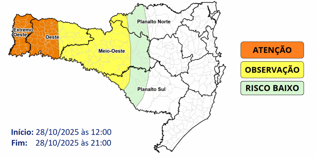 A Defesa Civil emitiu um alerta para temporais e chuvas intensas entre a tarde e noite desta terça-feira (28) no Grande Oeste catarinense. O risco é moderado a alto para alagamentos e enxurradas e baixo a moderado para destelhamentos, queda de galhos e árvores e danos na rede elétrica. A previsão é de que, até a noite, os temporais percam força, mas ainda se formam de maneira localizada entre o Meio Oeste e os Planaltos.