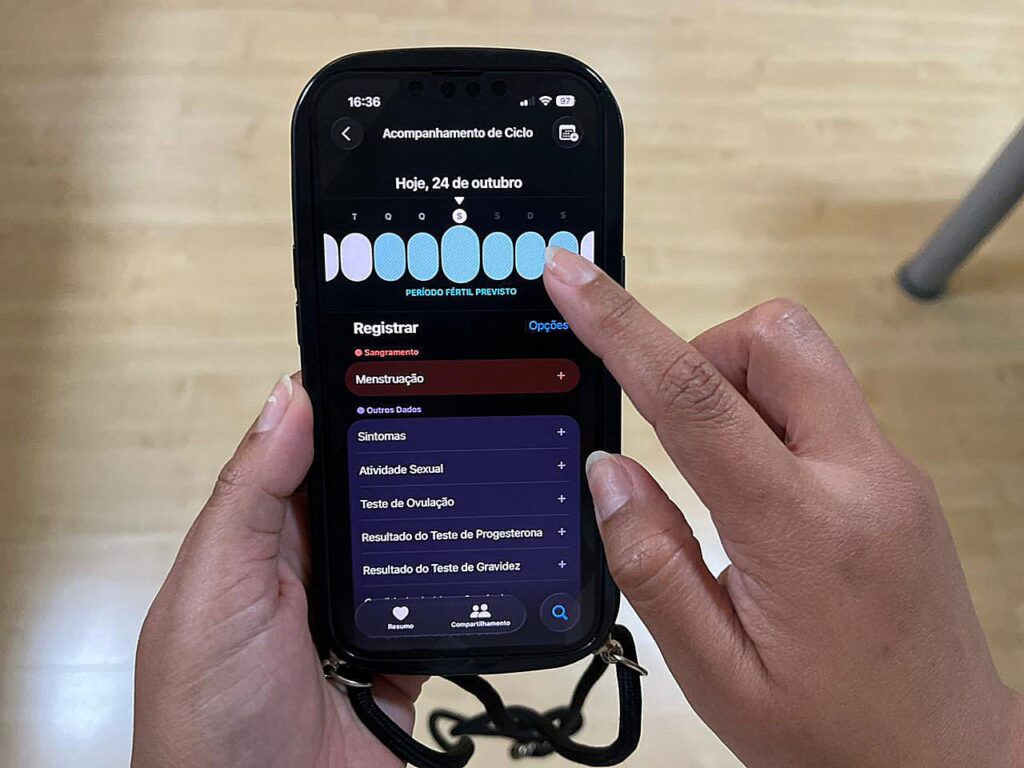 Hoje, é possível acompanhar o ciclo menstrual por meio de aplicativos de celular. Eles permitem registrar o fluxo, as fases, o período fértil e sintomas, ajudando a identificar alterações. Essas ferramentas também oferecem informações valiosas para a saúde da mulher, auxiliando no reconhecimento de mudanças hormonais e na adoção de medidas para aliviar desconfortos, como cólicas e alterações de humor, além de acompanhar sinais da menopausa, por exemplo.